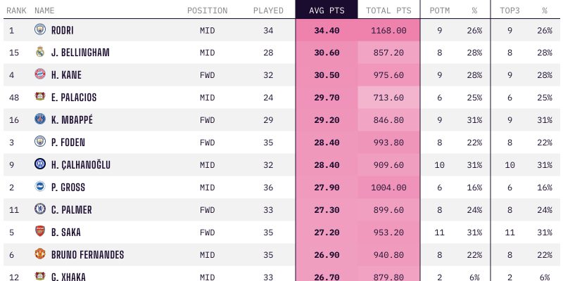 Fuel fans’ interest in star players, unsung heroes and future legends with a standardised, transparent, objective live player rating system that compares individual performances within and across teams, positions, leagues, tournaments and more – in real time.